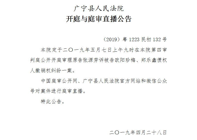 【广宁县人民法院开庭与庭审直播公告】5月8日3起案件公开开庭审理