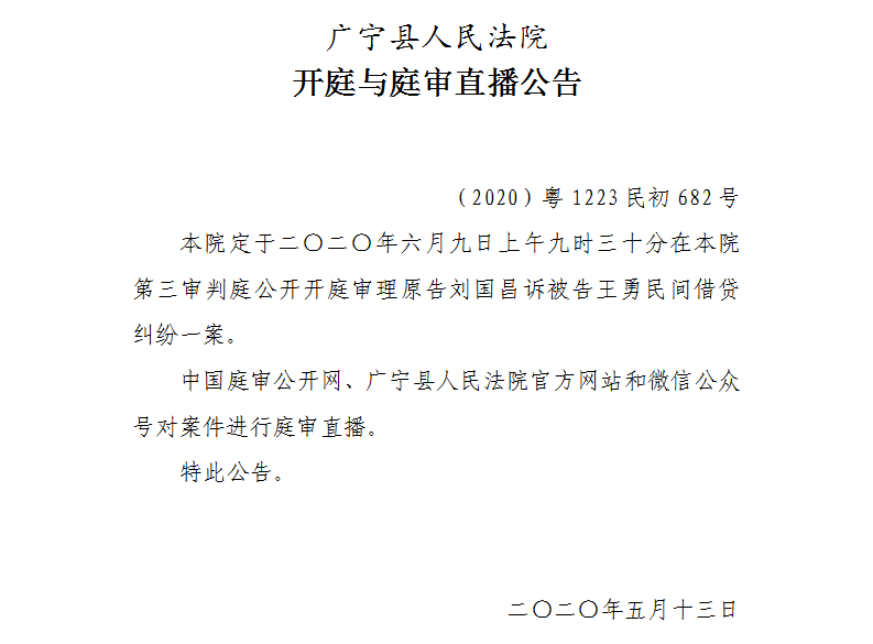 【广宁县人民法院开庭与庭审直播公告】6月10日1起案件公开开庭审理