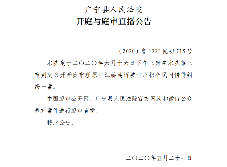 【广宁县人民法院开庭与庭审直播公告】6月16日3起案件公开开庭审理
