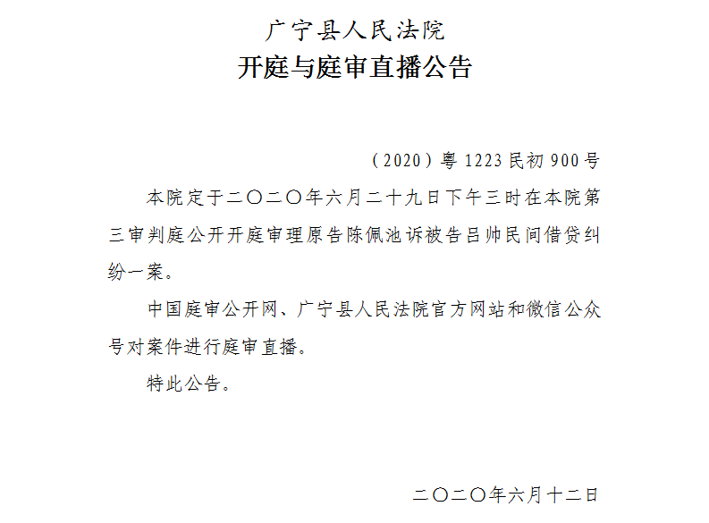 【广宁县人民法院开庭与庭审直播公告】6月30日3起案件公开开庭审理