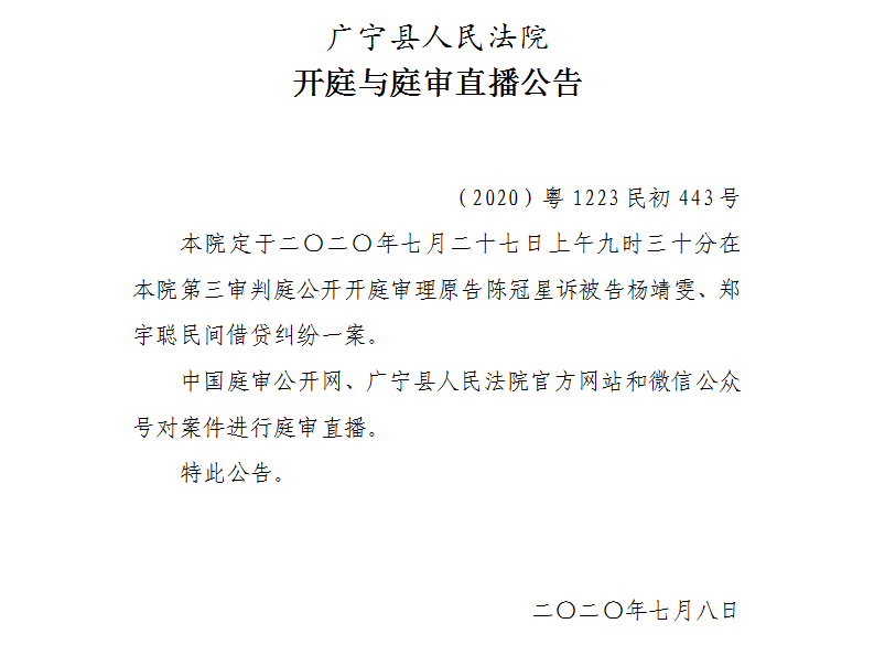 【广宁县人民法院开庭与庭审直播公告】7月27日4起案件公开开庭审理