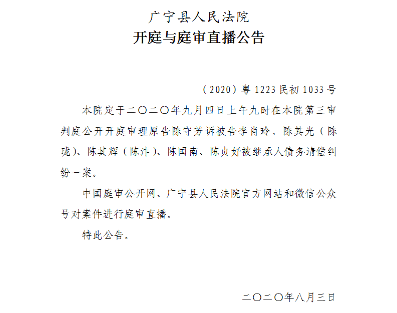 【广宁县人民法院开庭与庭审直播公告】9月4日1起案件公开开庭审理