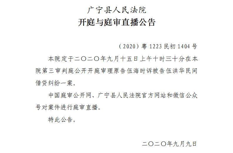 【广宁县人民法院开庭与庭审直播公告】9月15日4起案件公开开庭审理