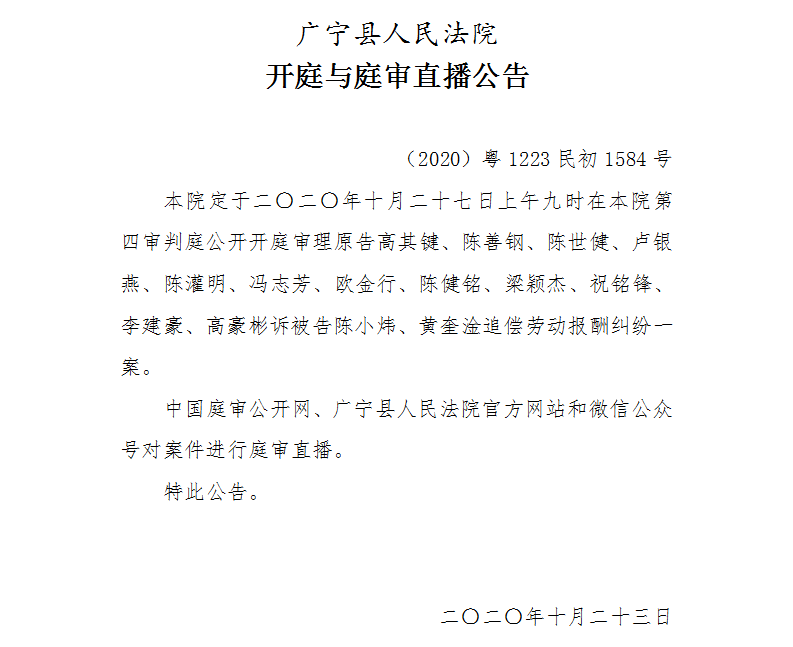 【广宁县人民法院开庭与庭审直播公告】10月23日1起案件公开开庭审理