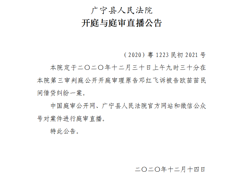 【广宁县人民法院开庭与庭审直播公告】12月31日 2起案件公开开庭审理