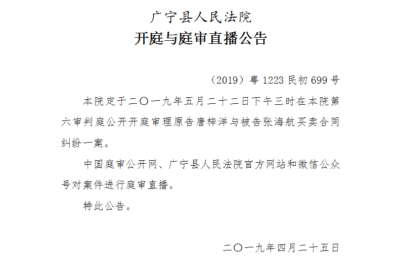 【广宁县人民法院开庭与庭审直播公告】5月23日4起案件公开开庭审理