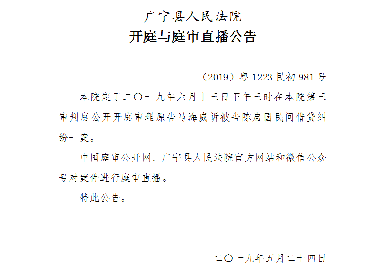 【广宁县人民法院开庭与庭审直播公告】6月14日3起案件公开开庭审理