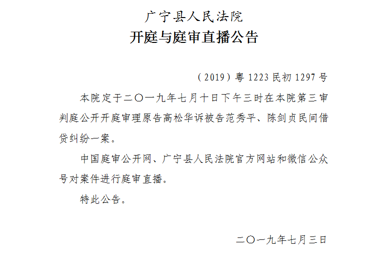 【广宁县人民法院开庭与庭审直播公告】7月9日4起案件公开开庭审理