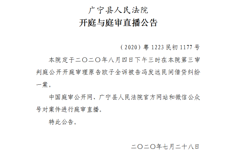 【广宁县人民法院开庭与庭审直播公告】8月3日1起案件公开开庭审理