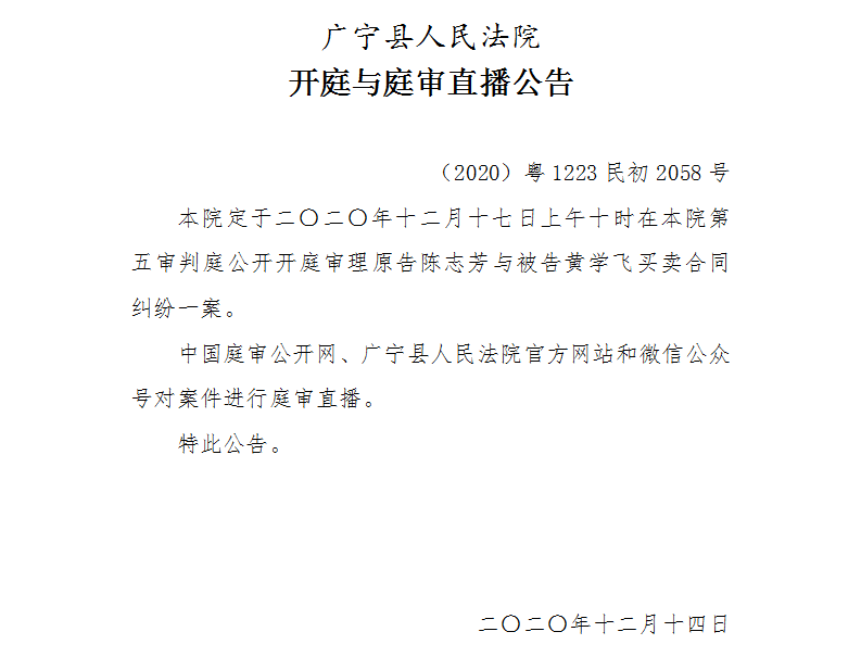 【广宁县人民法院开庭与庭审直播公告】12月17日10起案件公开开庭审理