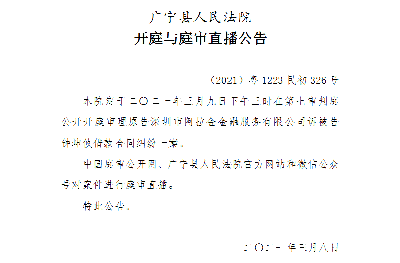 【广宁县人民法院开庭与庭审直播公告】3月8日2起案件公开开庭审理