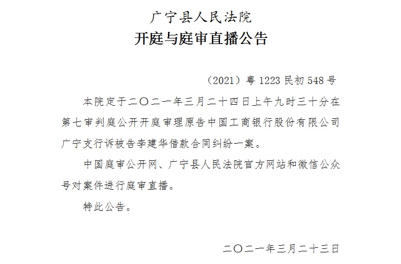 【广宁县人民法院开庭与庭审直播公告】3月23日6起案件公开开庭审理